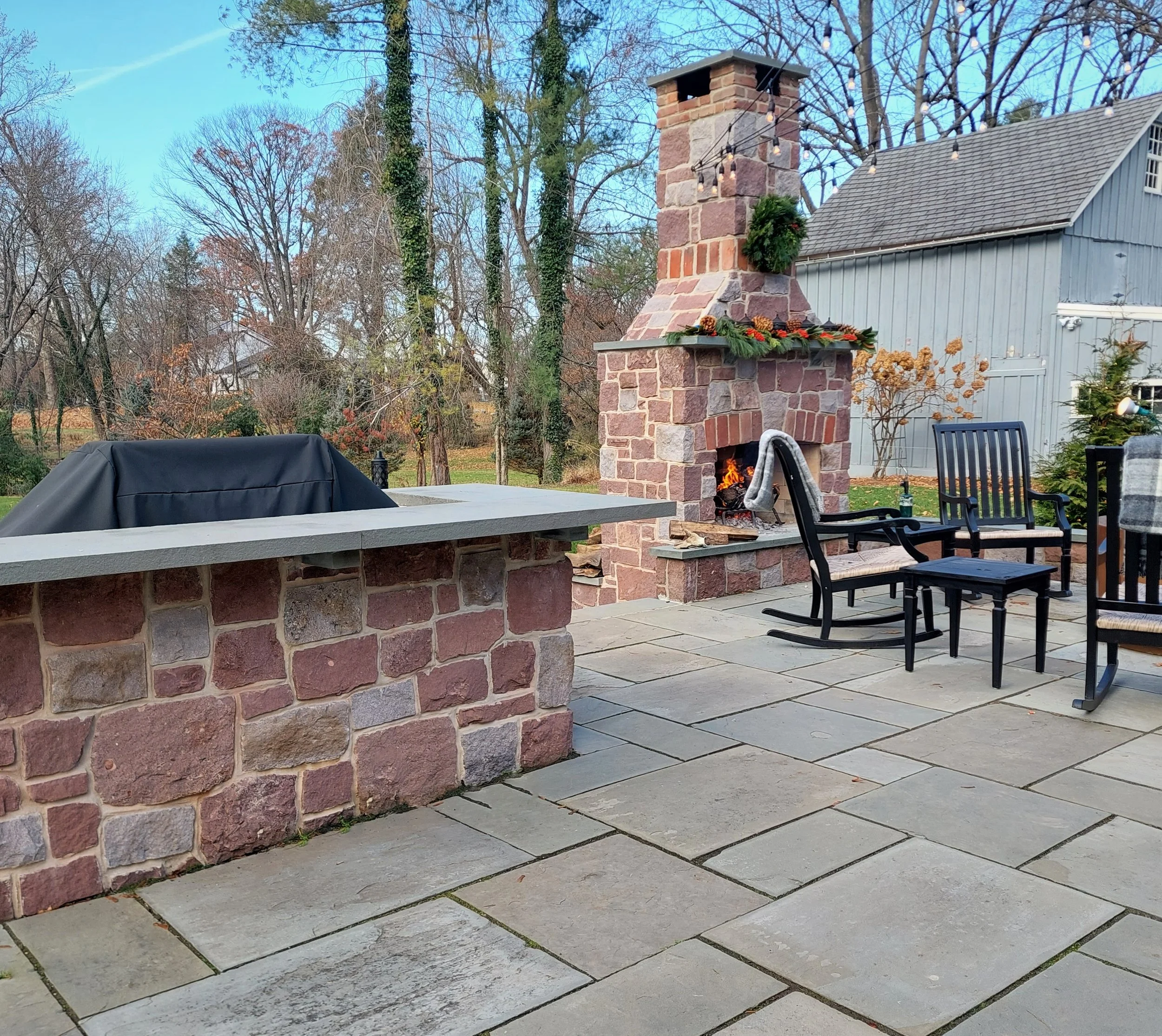 Stone fireplace set within a bluestone patio and seatwall with a grill surround and serving space.